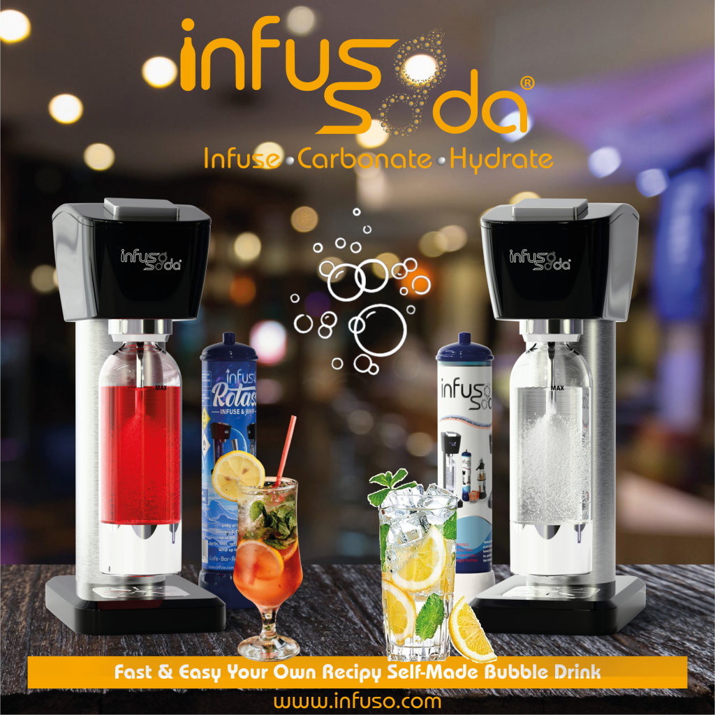 The versatile InfusoSoda machine is the world's first infusion & carbonation which uses recyclable single use steel cylinders of 640g Nitrous Oxide (N2O) or 640g Carbon Dioxide (CO2). No More Cylinder Exchange!